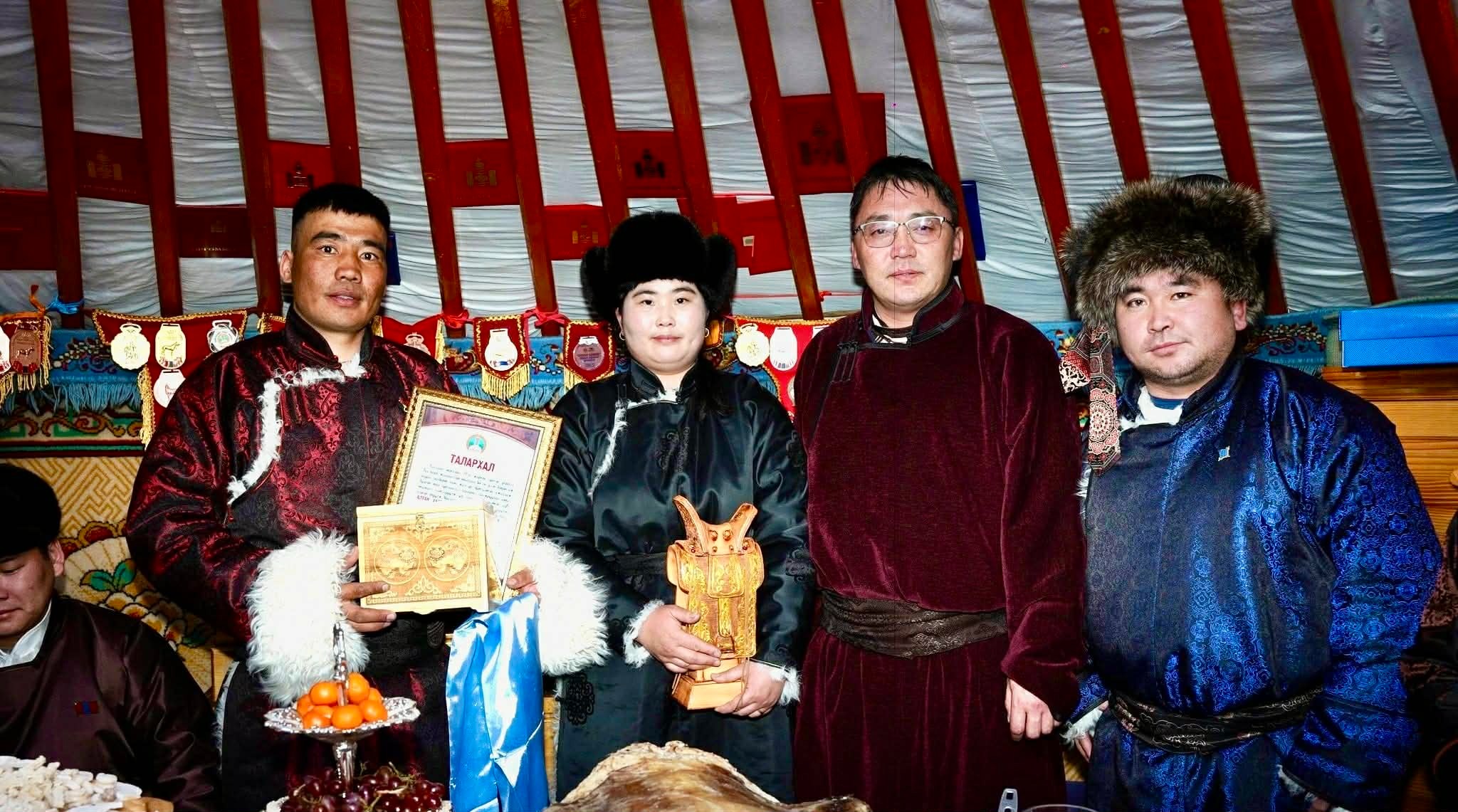 XVII жарны “Сүрээр дарагч” хэмээх Гал морин жилийн сар шинийн баярын босгон дээр “АЛТАН ХУРГАНЫ ЭЗЭН” болсон Т.Нямдорж, Э.Мөнхзул нарт Улсын Их Хурлын гишүүн М.Ганхүлэг, Хөгжлийн бодлого, төлөвлөлт, хөрөнгө оруулалтын хэлтсийн дарга Д.Баярхүү, сумын Иргэдийн төлөөлөгчдийн хурлын дарга Г.Жамцзанги, Засаг дарга О.Лхагвадорж нар шагналыг гардуулж баяр хүргэлээ.